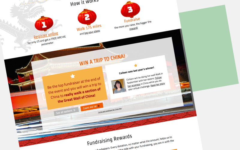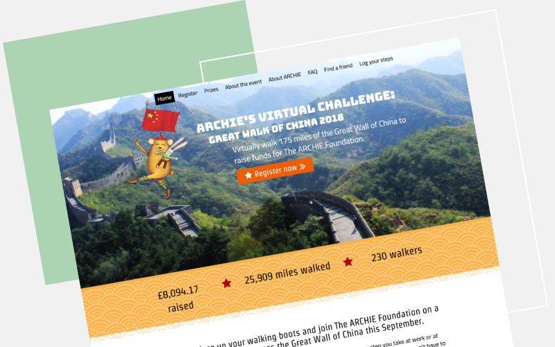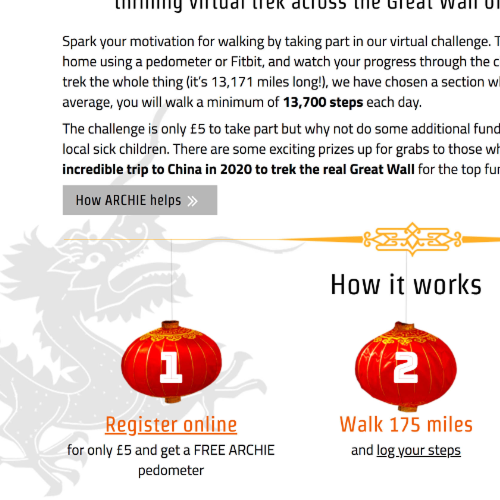 The ARCHIE Foundation is a children's hospital charity, and every year they do a virtual event with a different theme. 2017's theme was the Great Wall of China, where fundraisers would walk a 175 mile 'portion of the Great Wall', locally and in their own time during the month of September.