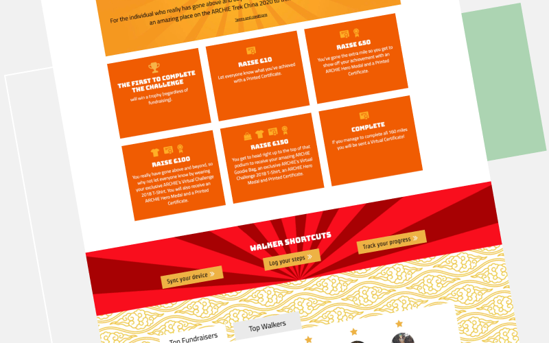 The microsite consists of a landing page which outlines what the event is, what is being asked of the fundraiser and they also (rightfully so) wanted to highlight the prizes. Further down the page is fundraiser-driven content such as leaderboards and a social feed. Other pages feature information about the charity, the event, FAQs, and how to find a friend to donate to them.