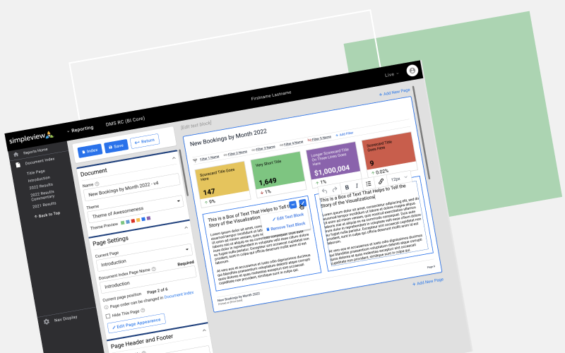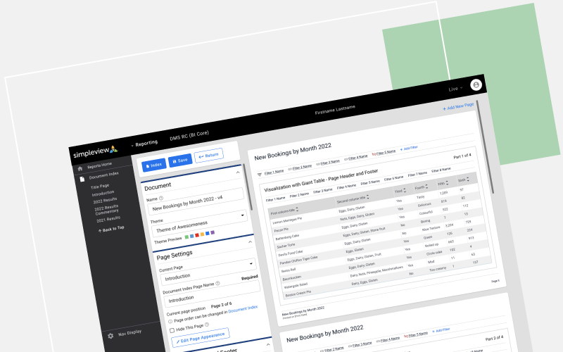 The document builder allows users to arrange visualisations (charts, graphs, data tables) into a paged document format. We offer some page templates and basic content additions to give some layout options.